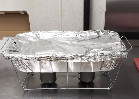 6. Place food, keeping in aluminum pans in case in, in chafers on top of aluminum pans with water in them.